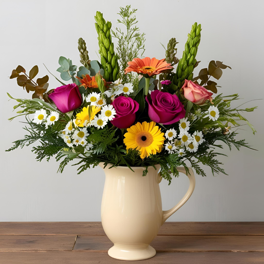 A celebration of colourful blooms featuring a vibrant orange Rose alongside long-lasting Carnations.